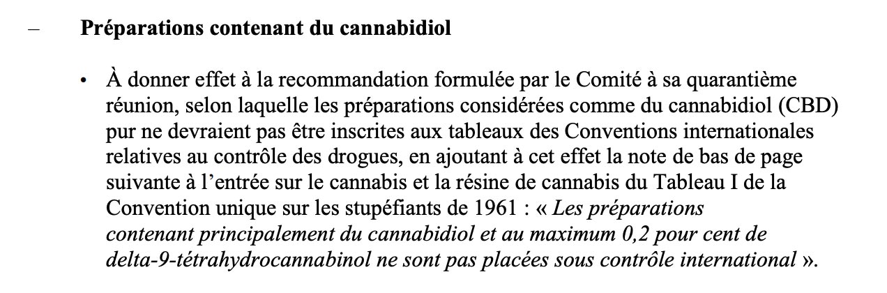 “Le cannabidiol peut être obtenu par synthèse chimique ou préparé à partir de la plante de cannabis. Une préparation pharmaceutique, l’Epidiolex, obtenue à partir de la plante, [a] été autorisée. Le Comité a noté que les préparations pharmaceutiques dépourvues d’effets psychoactifs qui sont produites à partir de la plante de cannabis vont contenir des traces de Δ⁹-THC [qui, lui, est listé dans les Tableaux]. […] En accord avec la recommandation tendant à ne pas soumettre au contrôle les préparations considérées comme du cannabidiol à l’état pur mais en reconnaissant que des traces de Δ⁹-THC peuvent être présentes dans ces préparations, par exemple à raison de 0,15 % dans l’Epidiolex, […] le Comité recommande d’ajouter la note de bas de page suivante au Tableau I de la Convention unique sur les stupéfiants de 1961 : ‘Les préparations contenant principalement du cannabidiol et au maximum 0,2 % de delta-9-tétrahydrocannabinol ne sont pas placées sous contrôle international’”[4]